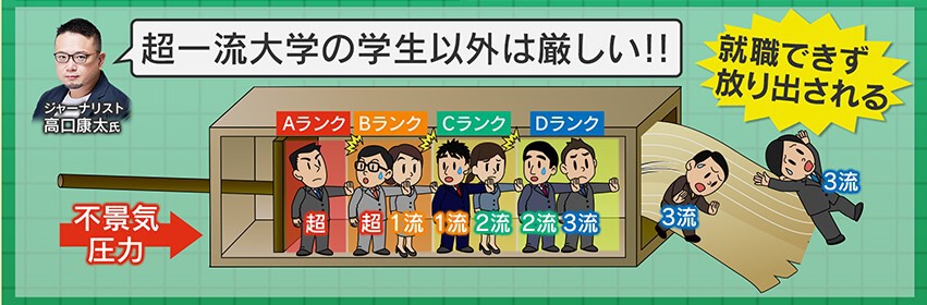 今の中国では、就職は“ところてん”だといいます。どういうことかというと、就職希望者が詰まっていて、不景気の圧力で枠が減ってしまうと、超一流といわれるランクの学生も一つ理想を下げて就職することになります。そして各ランクの学生が一つずつ希望を下げていった結果、下のランクの学生は就職できずに放り出されるということです。