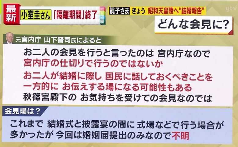はたして、どんな会見になるのか…。元宮内庁職員の山下さんによると、「お二人の会見を行うと言ったのは宮内庁なので、宮内庁仕切りで行うのではないか。お二人が結婚に際し、国民に話しておくべきことを一方的にお伝えする場になる可能性もある。秋篠宮殿下のお気持ちを受けての会見なのでは」ということです。会見場は、これまで結婚式と披露宴の間に式場などで行う場合が多かったですが、今回は婚姻届けの提出のみのため不明です。