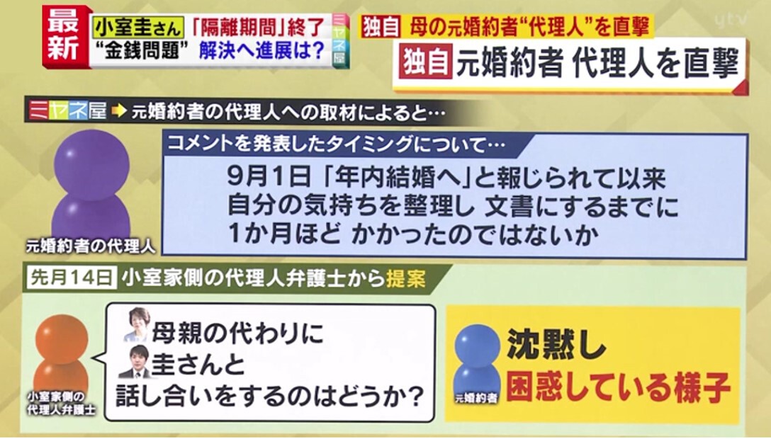 なぜ、このタイミングでコメントを発表したのか。番組では、10月11日に小室さんの母の元婚約者の代理人を独自取材しました。元婚約者の代理人によると「コメントを発表したタイミングについて、9月1日『年内結婚へ』と報じられて以来、自分の気持ちを整理し、文書にするまでに1か月ほどかかったのではないか」ということです。9月14日に、小室家側の代理人弁護士から「佳代さんの代わりに圭さんと話をするのはどうか?」という提案があり、婚約者の方に伝えると、沈黙し、困惑している様子だったということです。