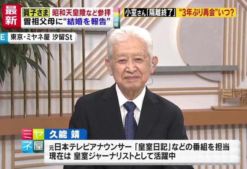 10月26日に結婚予定の秋篠宮家の長女・眞子さまが、曽祖父母にあたる昭和天皇と香淳皇后の陵を参拝し、結婚を報告されました。一方、お相手の小室圭さんは、新型コロナの隔離期間があけ12日から外出可能となり、結婚へ向けた本格的な準備に入るとみられています。元・日本テレビアナウンサーで、皇室ジャーナリストの久能靖(くのう・やすし)さんが独自解説します。