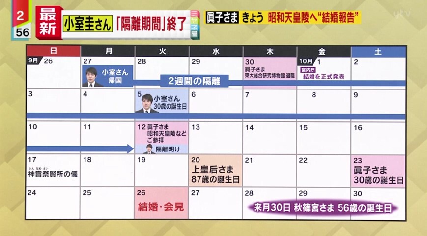 今後の日程ですが、17日には神嘗祭賢所の儀があり、26日には結婚・会見が行われます。