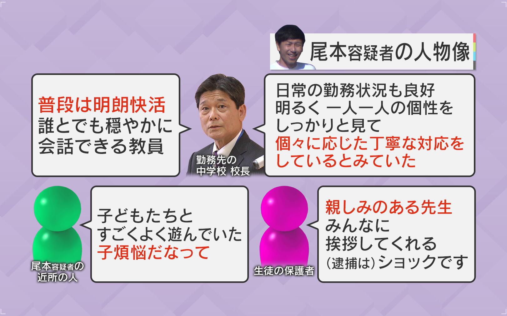 尾本容疑者が勤務する中学校の校長によると、容疑者の人物像は「普段は明朗快活。誰とでも穏やかに会話できる教員。日常の勤務状況も良好で明るく、一人一人の個性をしっかりと見て、個々に応じた丁寧な対応をしているとみていた」とのことです。また、容疑者の近所の人は「子どもたちとすごくよく遊んでいた。だから子煩悩だなって」と話しています。保護者の一人は「親しみのある先生だった。みんなに挨拶してくれる…ショックです」と語りました。