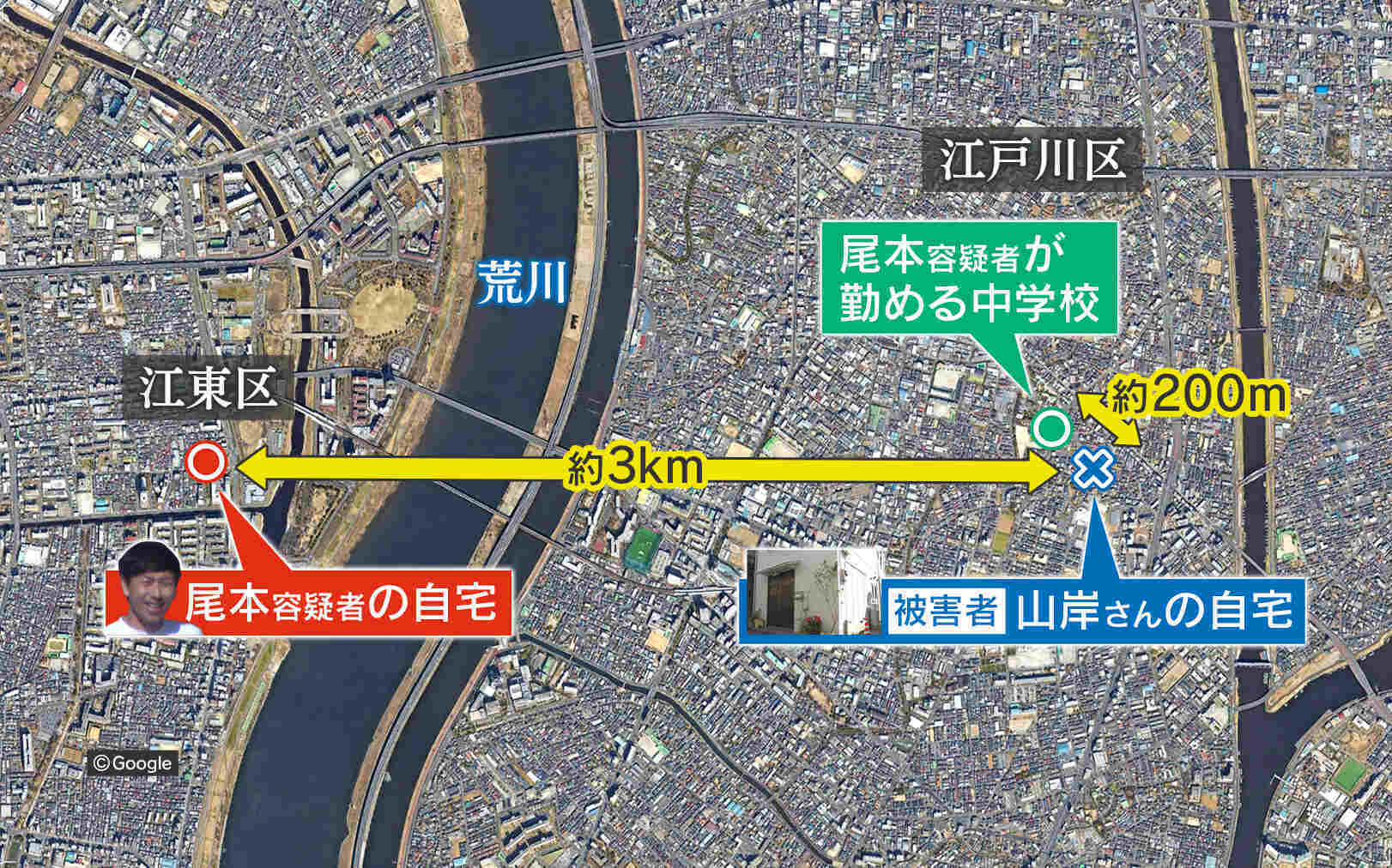 逮捕された尾本容疑者の勤務する中学校と、被害者の山岸さんの自宅とは約200mしか離れていません。また、容疑者の自宅と被害者の自宅との距離は、荒川を挟んで約3kmだということです。