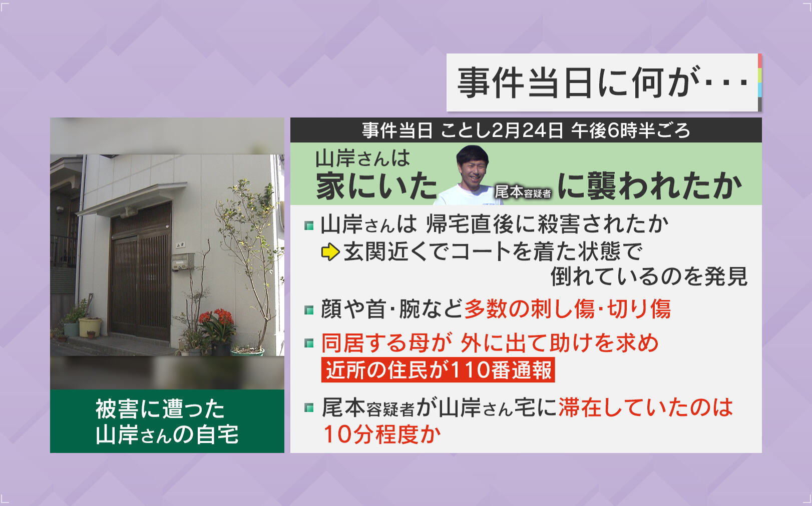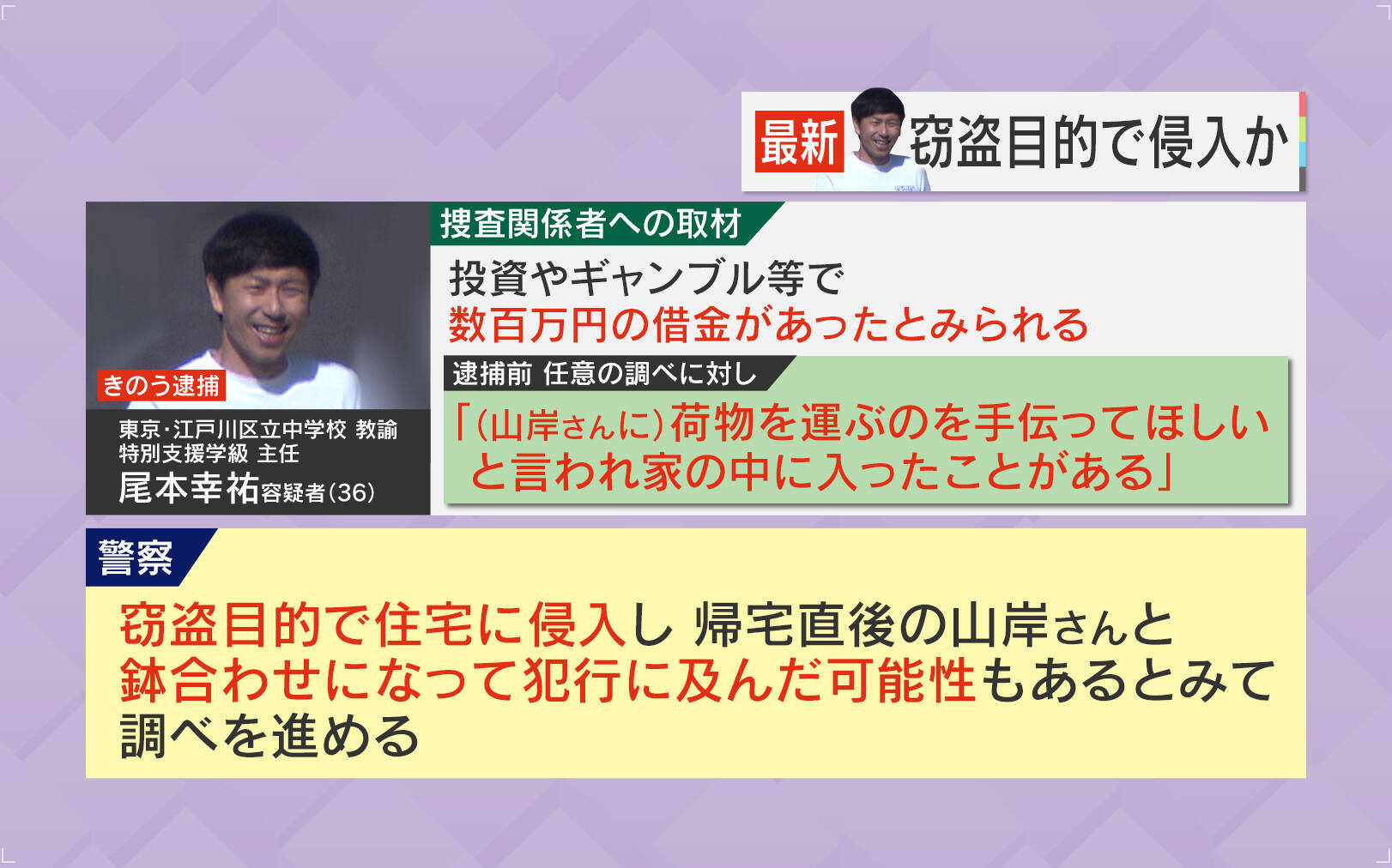尾本容疑者は、現場近くの防犯カメラの映像等から、事件への関与が浮上し逮捕に至りました。尾本容疑者は投資などで数百万円の借金があったとみられ、警視庁は、容疑者が窃盗の目的で住宅に侵入し、帰宅直後の山岸さんと鉢合わせになって犯行に及んだとみて詳しい状況を調べています。尾本容疑者は、警察の調べに対し「事件には関わっていません」と否認しているということです。
