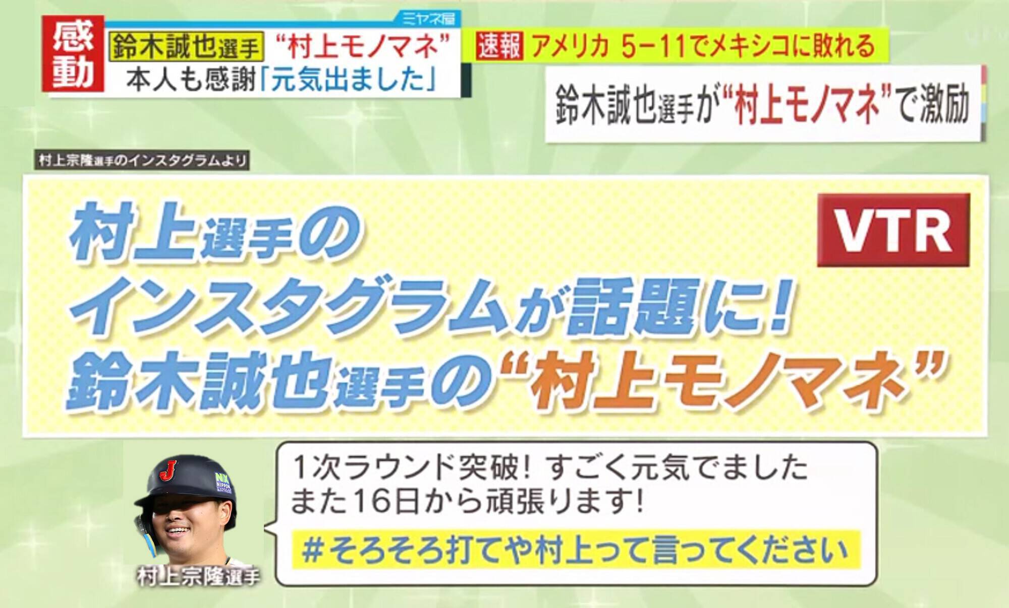 また、村上選手のモノマネをした鈴木誠也選手の動画が話題になっています。日本代表のユニフォームを着た鈴木選手が村上選手の応援歌が流れる中、バッターボックスへ向かうシーンから始まります。村上選手の癖を誇張するかのようなバッティングフォームから大きく態勢を崩し、空振り。しょんぼりしたままベンチへ戻り、悲しみのペッパーミルのパフォーマンス…しかし最後は「顔を上げて頑張れ!」と満面の笑みで伝えました。この動画をインスタグラムに公開した村上選手は「すごく元気出ました!また16日から頑張ります!」とし、「#そろそろ打てや村上って言ってください」のハッシュタグをつけて投稿すると、このハッシュタグがトレンド入りしました。鈴木選手はWBC日本代表に選出されていたものの、故障により出場を辞退しています。