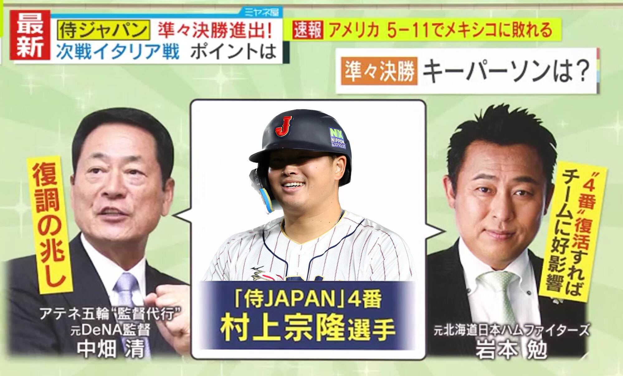元DeNA監督でアテネ五輪では日本代表を代行で指揮した中畑清氏と、元日本ハムファイターズの岩本勉氏は、3月16日に迫る準々決勝・イタリア戦のキーパーソンとして「村上選手」を挙げています。
