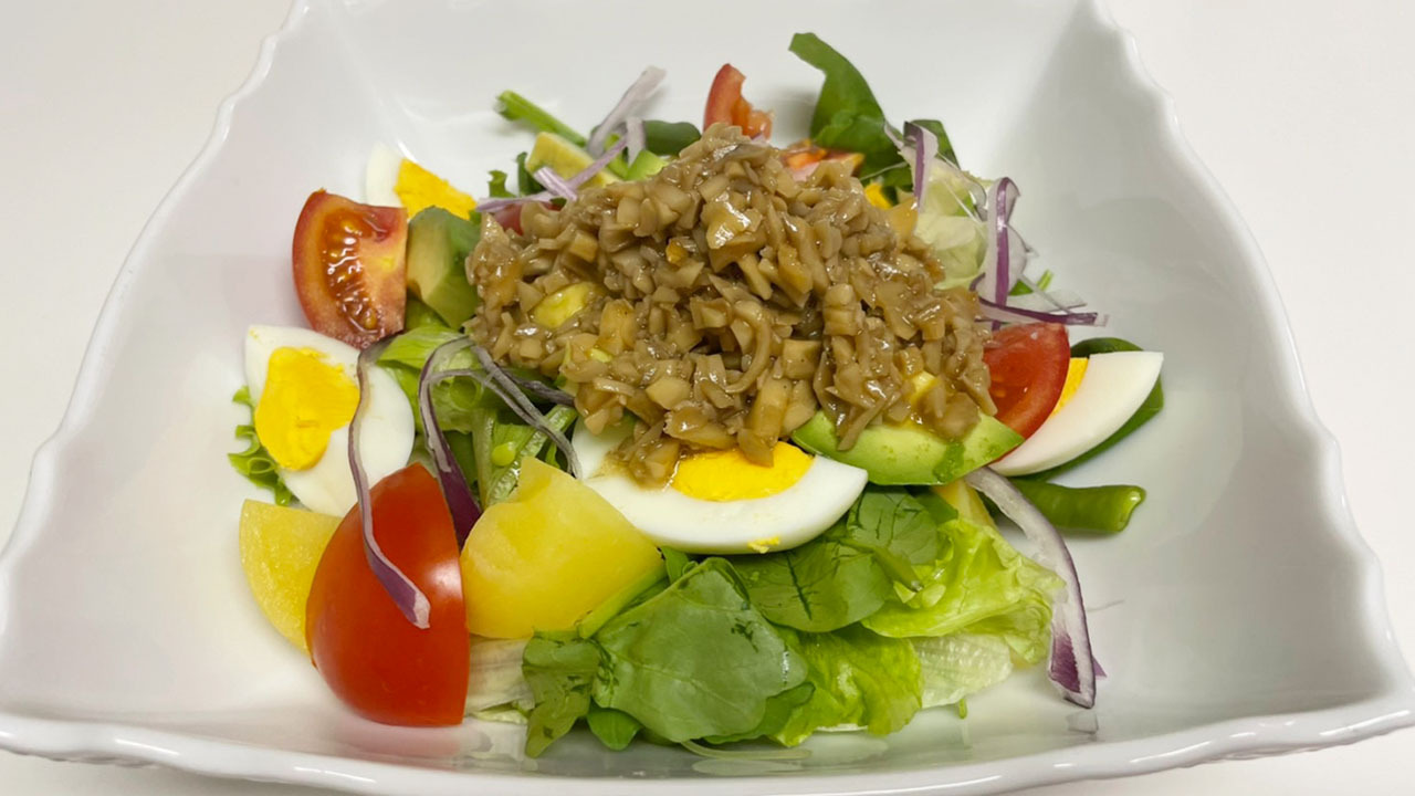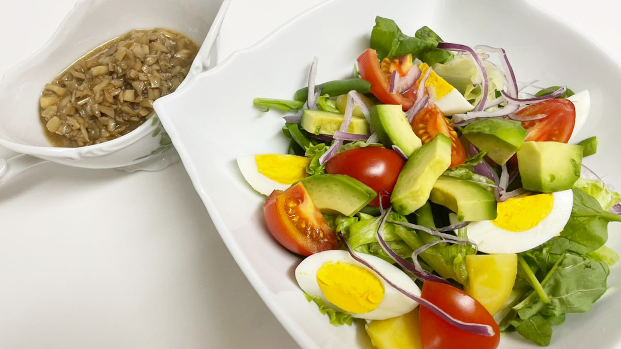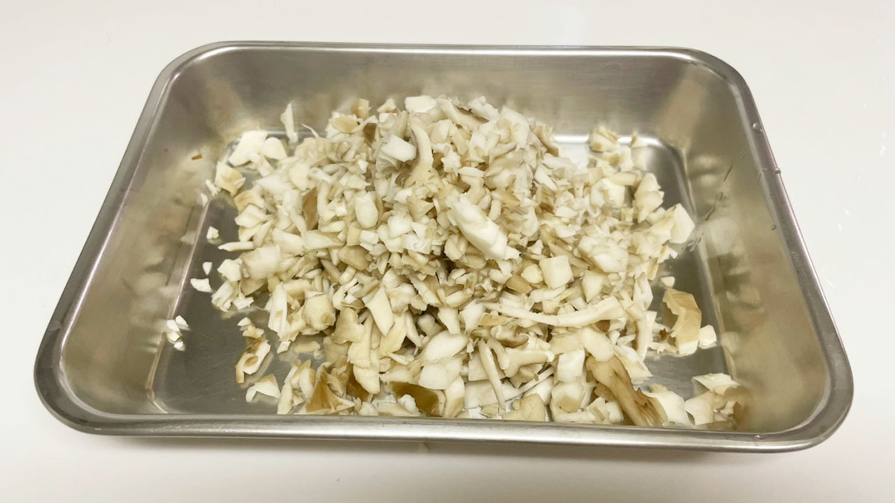 ① まいたけをみじん切りにする② フライパンにバターを溶かし、まいたけを炒める③ ②に水、オイスターソース、軽く塩胡椒をして火を止め粗熱をとる④ まいたけにトリュフオイルを入れ、お好みのサラダにたっぷりかける