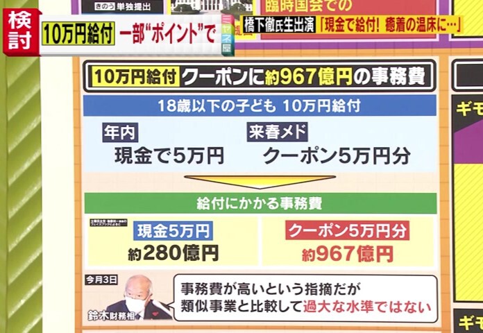18歳以下への“10万円給付”について。政府は18歳以下の子どもに対し、年内に現金で5万円、来春めどにクーポンで5万円分の合計10万円を給付するとしています。この給付にかかる事務費は、現金5万円給付に対して約280億円、そしてクーポン5万円分の配布には約967億円かかるということで、批判を呼んでいます。