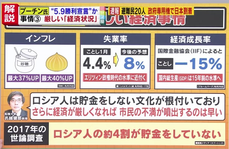 「ある日突然、紙幣が使えなくなったり、ハイパーインフレで1日のうちに物価が20倍、30倍になるという経験をしていますから、“金を持っていても仕方ない”、“通貨を信用していない”ところがあって、“金を持っていたらすぐ使うべきだ”という文化なのです。ロシア人の給料っていうのは、月5、6万と安いということもあって、貯金のない人が多いということです。さらに経済が厳しくなれば、市民の不満が噴出するのは早いと思われます」