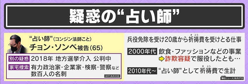 兵役免除を受けて20歳から祈祷費を受け取る仕事をしていました。2000年代には飲食やファッションなどの事業をしていましたが、詐欺容疑で服役したこともあるとのことです。そして2010年代には“占い師”として祈祷費で生計を立てていたといいます。