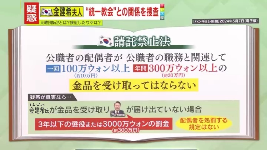 実は、『請託禁止法』という法律があり、『公職者の配偶者が、公職者の職務と関連して一回100万ウォン(約10万円)以上、年間300万ウォン(約30万円)以上の金品を受け取ってはならい』と規定されています。