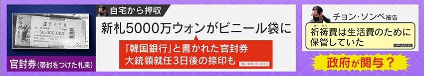 さらに、自宅から出所が不明の多額のお金が押収され、その一部に、国が発行する『官封券(帯封をつけた札束)』5000万ウォンが含まれていたといいます。中には、ユン前大統領の就任3日後の印字もあり、政府の関与も疑われています。