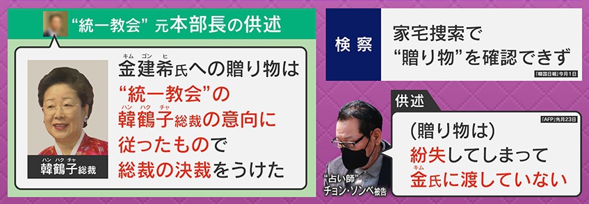 “統一教会”元本部長の供述によると、「キム・ゴンヒ氏への贈り物は“統一教会”のハン・ハクチャ総裁の意向に従ったもので、総裁の決裁をうけた」としています。