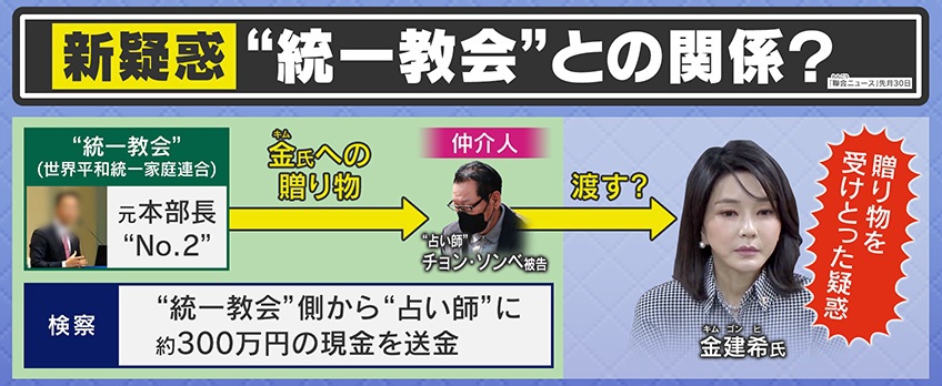“統一教会”の元本部長で“ナンバー2”とされる男性が、仲介人である“占い師”のチョン・ソンべ被告を通じて贈り物を贈り、キム氏はそれを受け取ったという疑惑が浮上しています。さらに検察は“統一教会”側から、“占い師”に約300万円の現金が送金されていることを確認しているとのことです。