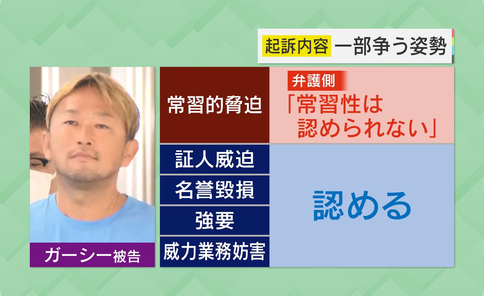 ガーシー被告の起訴内容は、俳優・綾野剛氏やジュエリーデザイナーなど4人への「常習的脅迫」と、さらにその2人に対し刑事告訴を取り下げさせようと脅した「証人威迫」、そのほか「名誉毀損」「強要」「威力業務妨害」などの罪に問われています。弁護側は、「常習性は認められない」としていますが、ほかの罪に関しては認めています。
