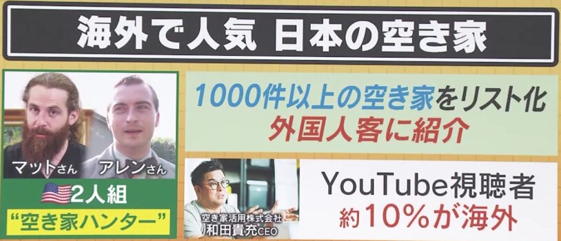 今、海外で日本の古い家が大人気です。日本在住歴の長いアメリカ人2人組が「空き家ハンター」として1000件以上の空き家をリスト化し、外国人客に紹介しています。また、和田CEOのYouTubeも、視聴者の約10%が海外の方だそうです。