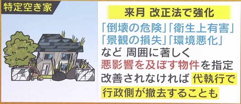 「特定空き家」とは、「建物が倒壊する危険がある」「衛生上有害とみなされる」「周辺の景観を損なう」「生活環境を悪化させる」など周囲に著しく悪影響を及ぼす物件を指定するもので、改善されなければ代執行で行政側が撤去することもあります。これが、12月の改正法で強化されます。