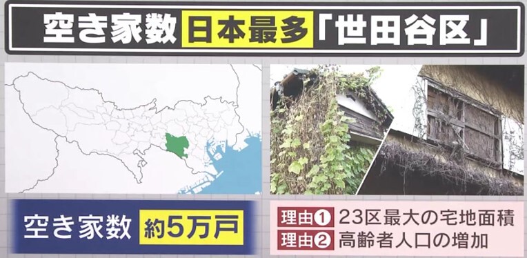 空き家の数が日本一多いのが、東京・世田谷区。一つの区だけで、約5万戸あるといいます。その理由の1つは「23区最大の宅地面積だということ」、さらに「高齢者の人口が増えていること」です。