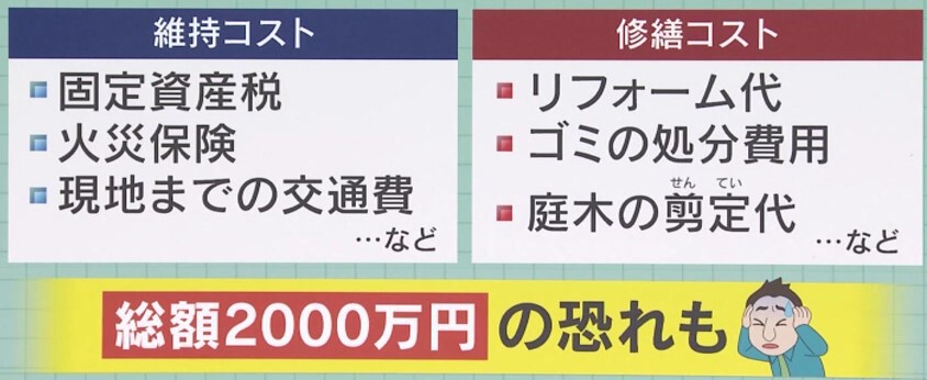 しかし、空き家を放置したときのコストは高額です。「固定資産税」「火災保険」、現地までの「交通費」などの維持コスト、さらに修繕コストとして「リフォーム代」「ゴミの処分費用」「庭木の剪定代」などがかかります。場合によっては、総額で2000万円ほどになる恐れもあるということです。