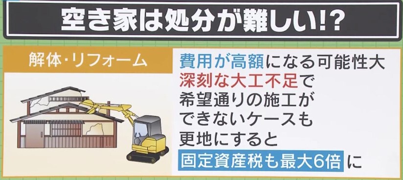 しかし、空き家を解体・リフォームしようとしても、費用が高額になる可能性が高く、深刻な大工不足で思うような施工ができないケースも発生しています。また、更地にすると、固定資産税が最大で6倍になる恐れがあります。