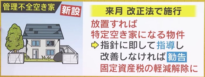 「空き家」は、通年で人の出入りがなく、水道・電気・ガスの使用状況などを見て、空き家かどうか自治体が判断しています。12月の改正法の大きなポイントの1つが、「管理不全空き家」に認定できるようになることです。このまま放置すれば「特定空き家」になる物件は、指針に即して所有者を指導し、改善しなければ勧告、固定資産税の軽減は解除されます。