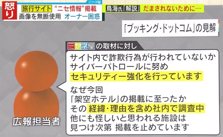 「ミヤネ屋」の取材に対し「ブッキング・ドットコム」の広報担当者は、「サイト内で詐欺行為が行われていないか、サイバーパトロールに努め、セキュリティー強化を行っています。なぜ今回“架空ホテル”の掲載に至ったか、その経緯・理由を含め、社内で調査中です。他にも怪しいと思われる施設は、見つけ次第掲載を止めています」としています。また、「『ブッキング・ドットコム』を騙るメールにご注意ください。予約成立後に再度クレジット番号や追加の料金などを要求することはありません」と注意喚起もしています。