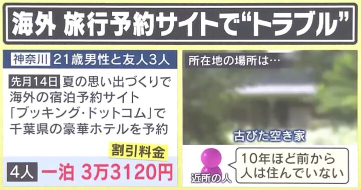 しかし当日、男性が友人3人と記載されていた住所に行ってみると、あったのは古びた空き家だけ。近所の人によると、10年ほど前から誰も住んでいない家でした。トラブルに遭った男性は、「お盆休みで他の宿も取れない中、騙されたなと。半月後に全額返ってきたが、悲しい気持ちは変わらない」と話しています。