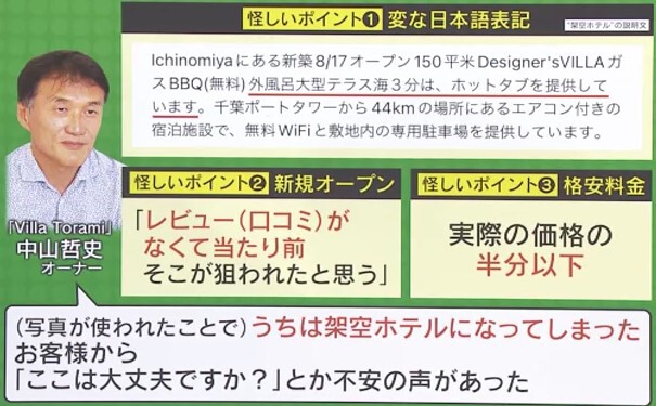 今回、写真が無断使用されたことで、「うちは架空ホテルになってしまった。お客様から『ここは大丈夫ですか?』など不安の声があった」という貸別荘のオーナー・中山哲史氏。中山氏によると、「ブッキング・ドットコム」に掲載されていた宿泊情報には、3つの怪しいポイントがあったといいます。