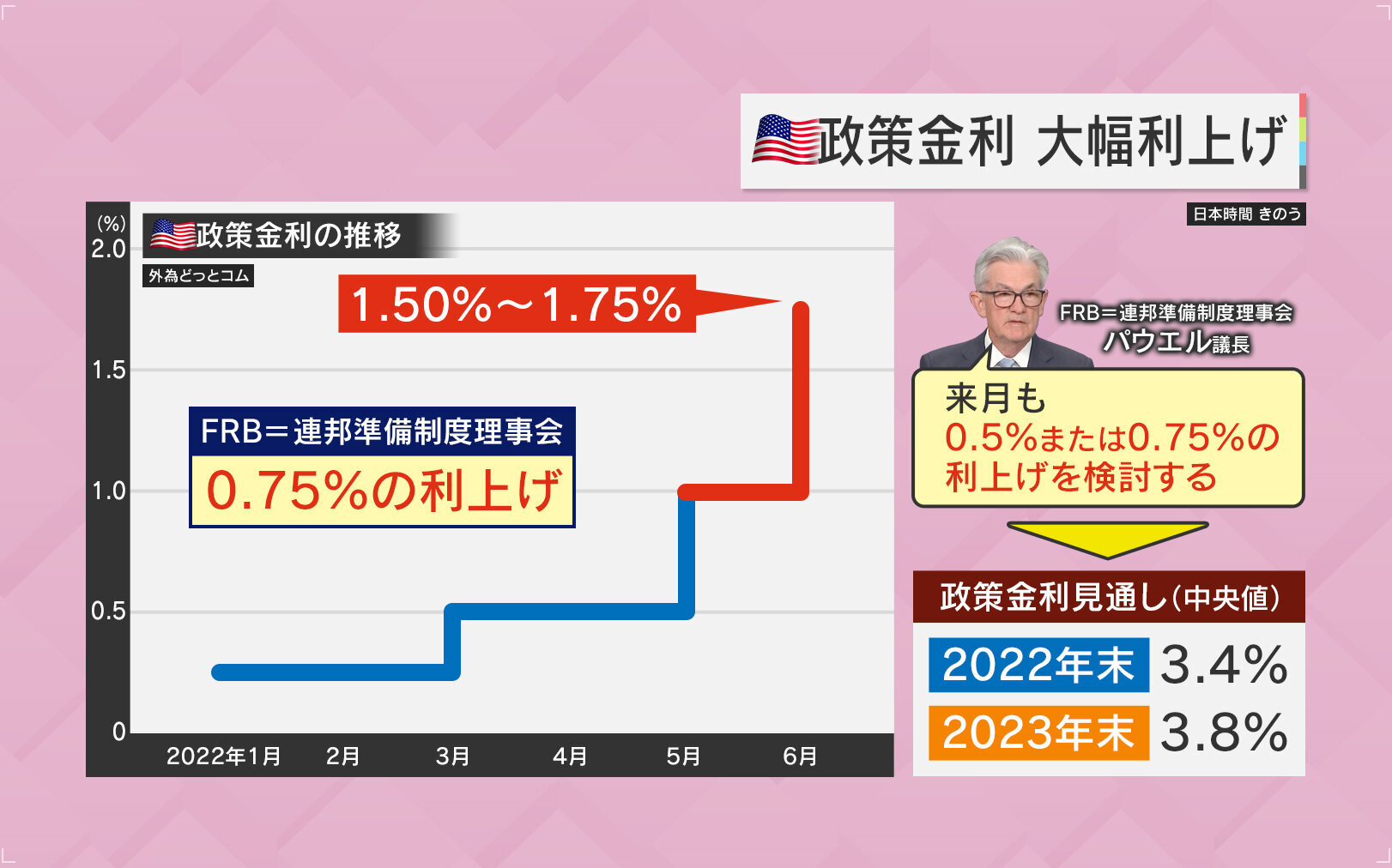 一方で6月15日、アメリカ・FRB(連邦準備制度理事会)は0.75%の利上げを発表しました。さらに7月にも、0.5%または0.75%の利上げを検討するとしています。