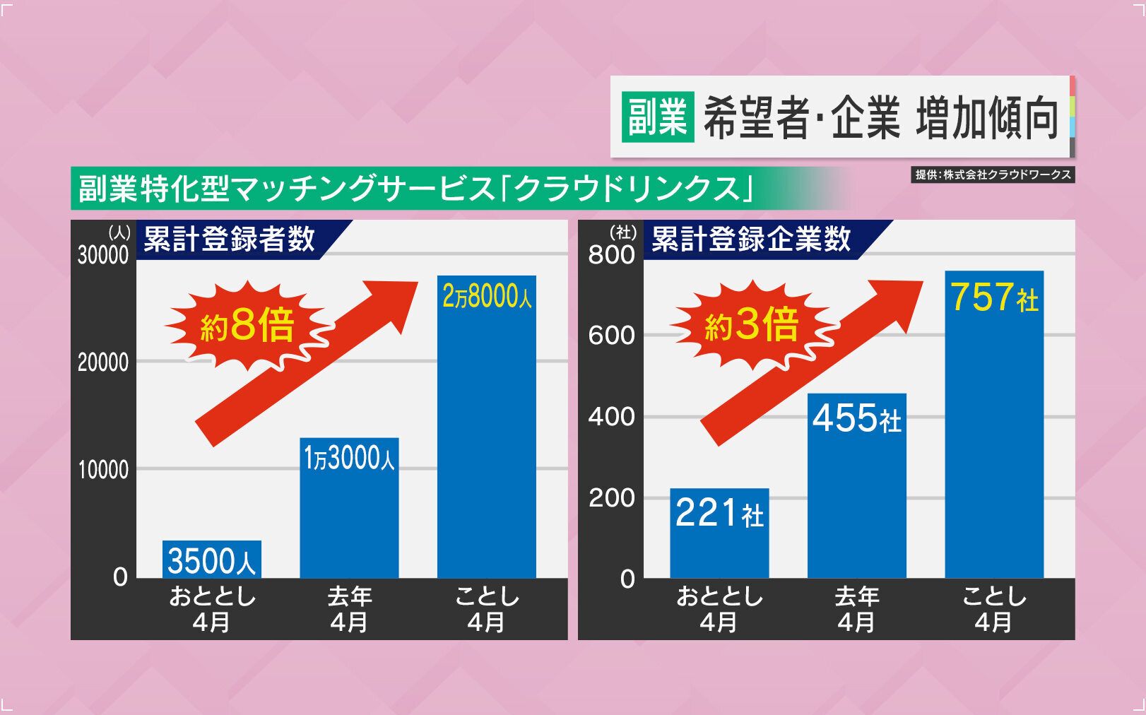 副業については、副業したい人と企業をマッチングさせる「副業特化型マッチングサービス」というものがあります。これに登録している人は、2年前に比べて8倍に増えており、登録している企業も3倍に増えているそうです。中には、30代の会社員の男性で、2018年に働きながらファイナンシャルプランナー2級の資格を取得し、妻が育児のため仕事をやめたものの、世帯収入は150万円増えたという例もあります。