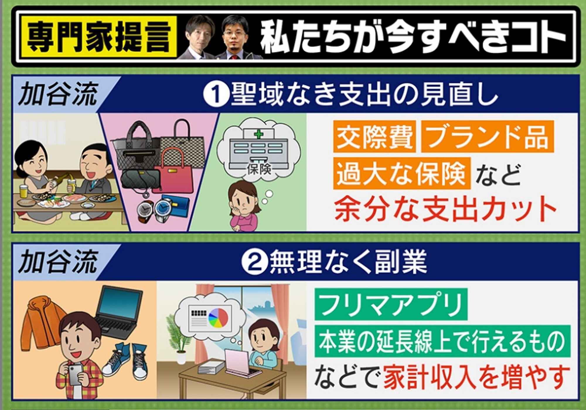 「一つ目は、聖域なき支出の見直しです。具体的には、交際費やブランド品、過大な保険など、余分な支出のカットです。保険なども、よく見直すと無駄がありますので、もう一度ゼロベースでよく見直すことも大事だと思います」