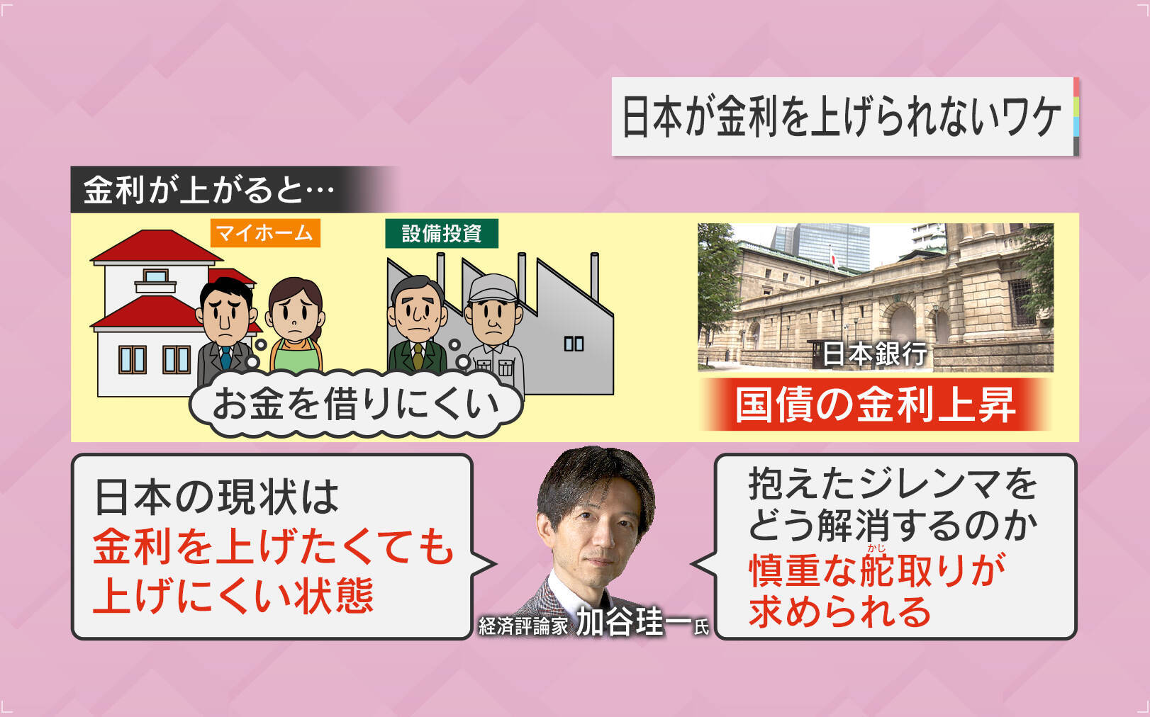 「金利が上がると、個人が家を買うにも、企業が設備投資するにも、お金が借りにくくなります。また日銀としても、国債の金利が上昇するのは利払いが多くなるなどデメリットがあります。この20年間“低金利”に慣れてしまっていて、急にこの状況を変えると混乱が生じるのも理由の一つですし、日銀としては今まで行ってきた“量的緩和策”をちゃんと成果が出るまで継続したいという思いもあり、これらが合わさって当面政策の変更はないということです」