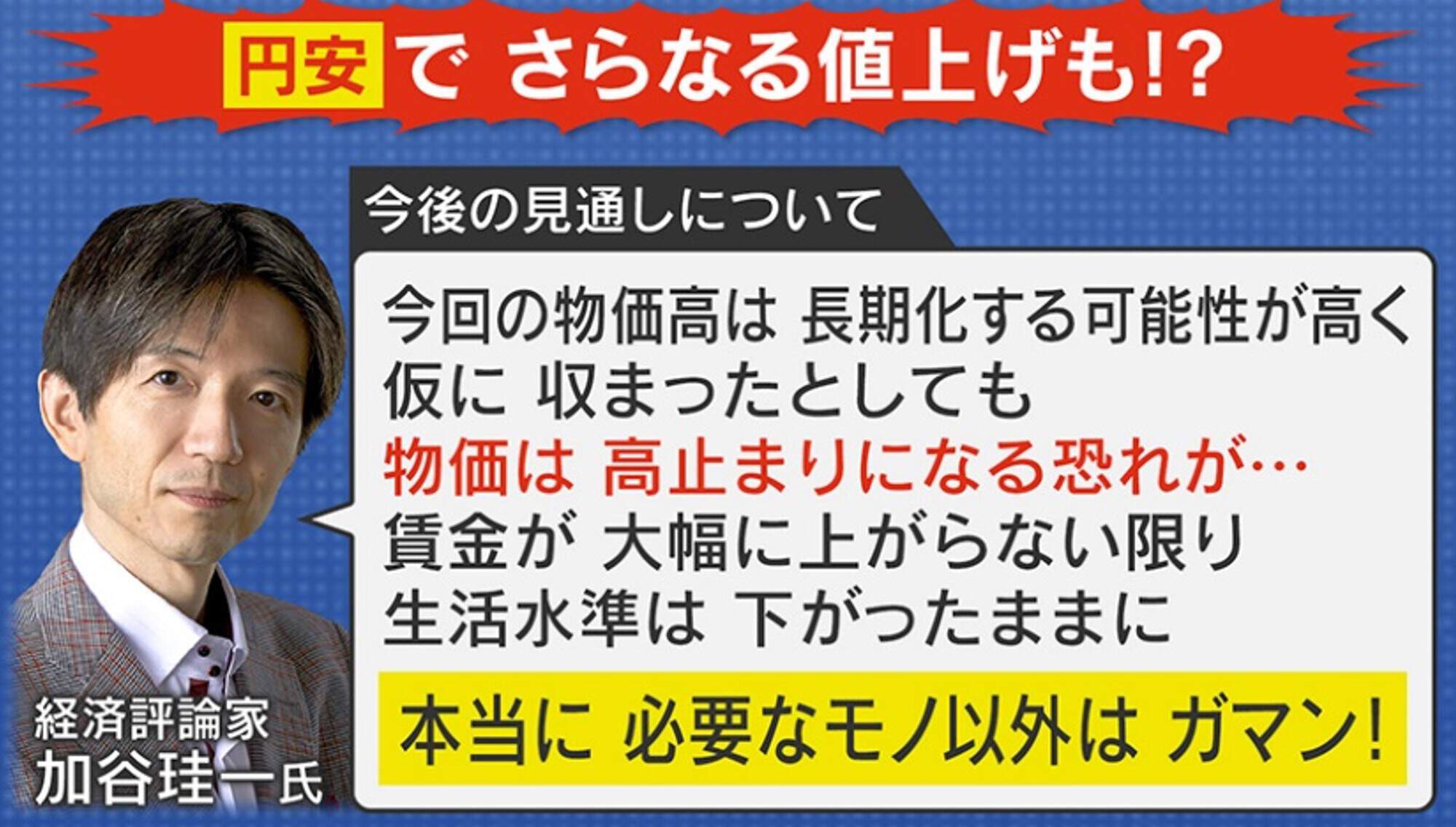 「今回の物価高は長期化する可能性が高く、仮におさまったとしても物価は高止まりになる恐れがあります。賃金が大幅に上がらない限り、生活水準は下がったままになると思います」