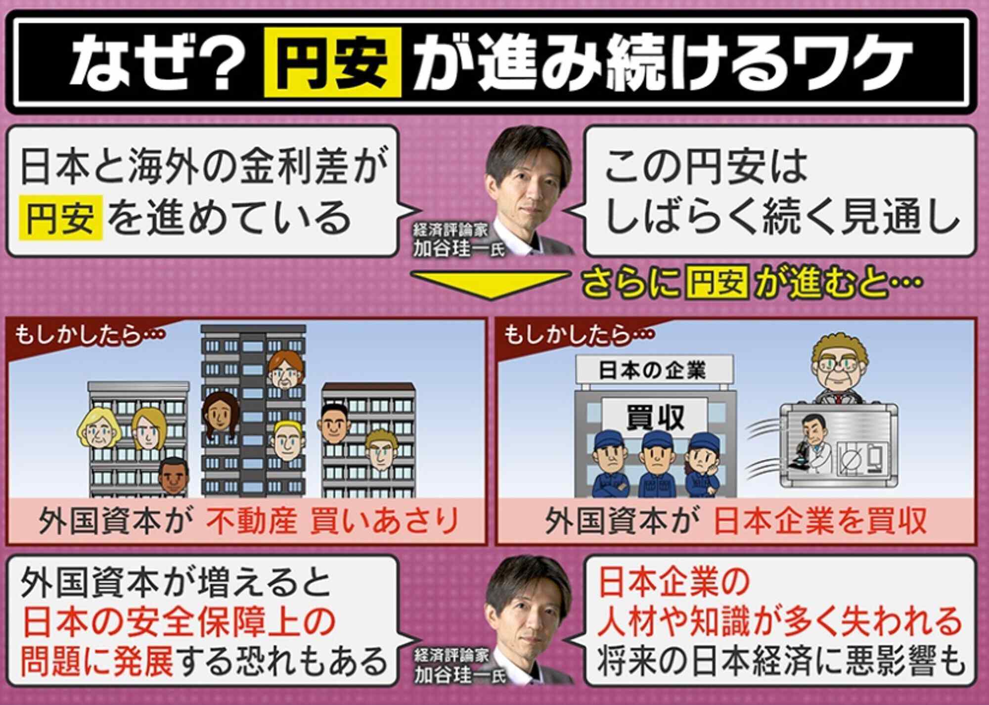 「もしかすると外国資本が、日本の不動産を買いあさるかもしれません。また、日本の企業を買収する動きも出るかもしれません。外国資本が増えると、日本の安全保障上の問題に発展する恐れもあります。日本企業の人材や知識が多く失われ、将来の日本経済に悪影響が出る可能性があります」