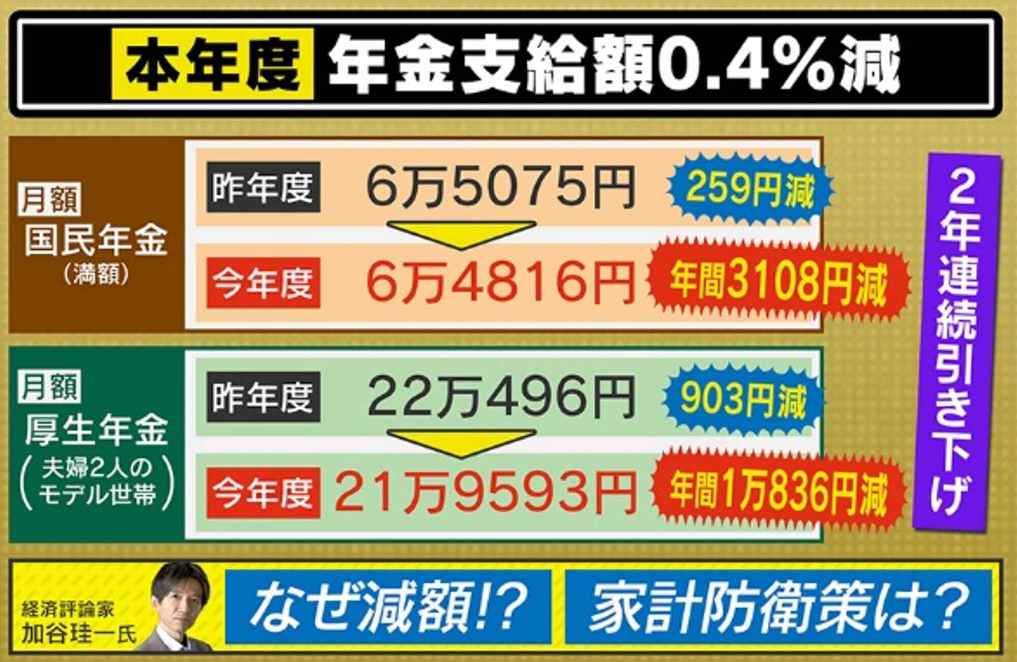 また、物価が上昇していく中で、年金の支給額が減っています。自営業者などが加入している国民年金は、ひと月当たり259円、年間で3108円の減少に、また、会社員などが加入している厚生年金は、1日903円、年間だと1万836円の減少になります。昨年も0.1%の引き下げがあったため、2年連続の減額となりました。