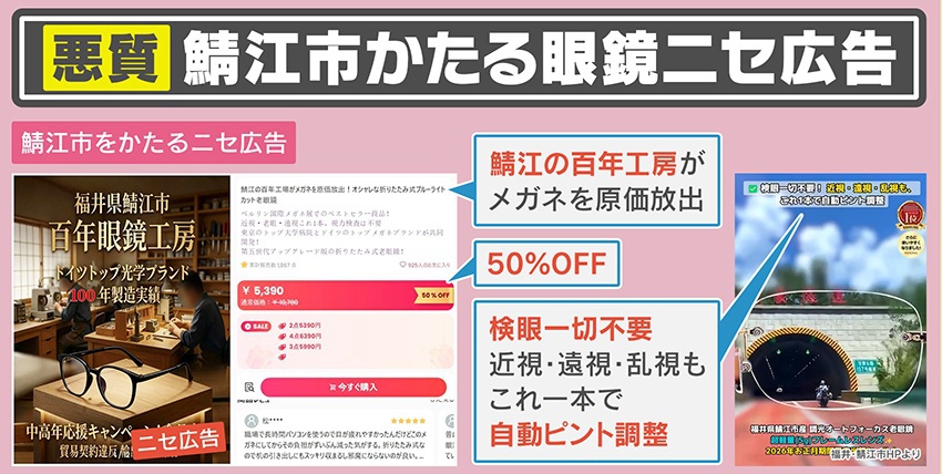 【悪質】“自動ピント調整機能付きメガネ”が85%オフ⁉鯖江市かたるニセ広告に要注意 『復興支援セール』善意につけこむ行為に市が憤り