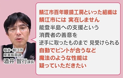 市の名前を使われた福井・鯖江市の担当者は、「『鯖江市百年眼鏡工房』といった組織は鯖江市には実在しない。能登半島への支援という消費者の善意を逆手に取ったものまで見受けられる。自動でピントが合うなど魔法のような性能は疑っていただきたい」と話していました。