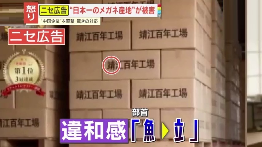 しかし、動画をよく視聴してみると、「若いほう(方)からご年配のほう(方)まで幅広く使えます」「パーセント98のほうが、視界がよりクリアになったと…」など、不自然な日本語がちらほら。段ボールに書かれていた『靖江』という漢字も、サバ(鯖)なら魚へんですが、立へんで表記されているなど違和感だらけです。