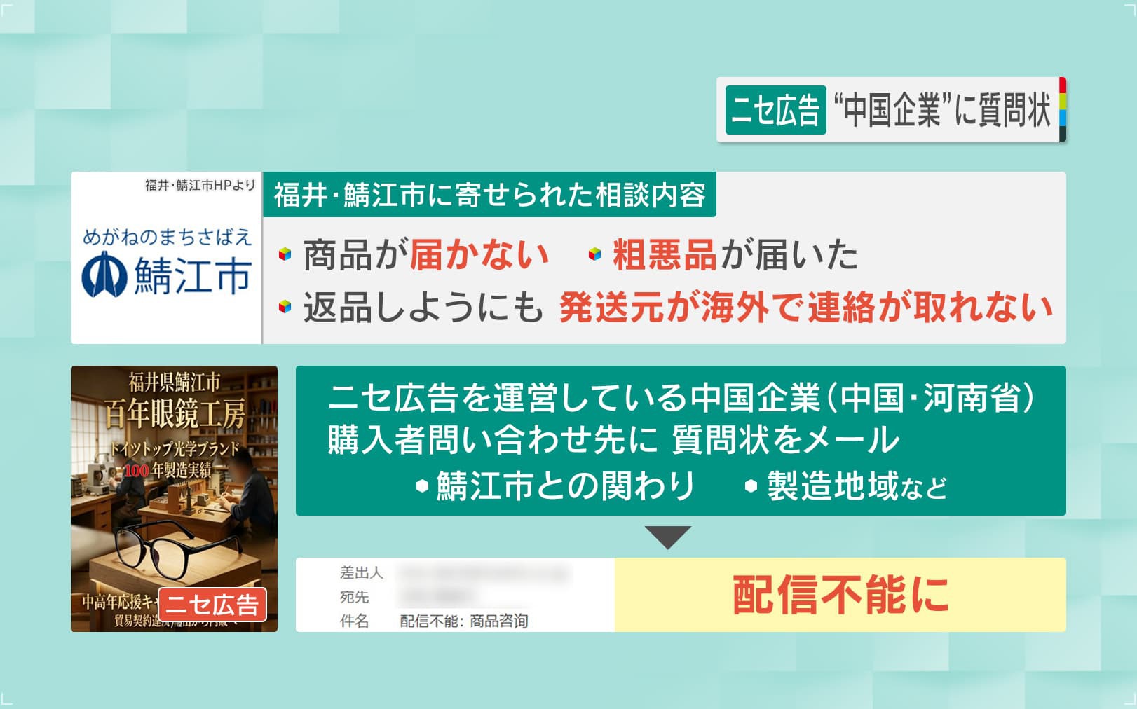 そこで番組は、ニセ広告を運営している中国企業(中国・河南省)の購入者問い合わせ先に『鯖江市との関わり』『製造地域』などを質問状としてメールを送信しようとしましたが、『配信不能』として、送ることさえできませんでした。
