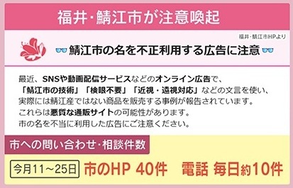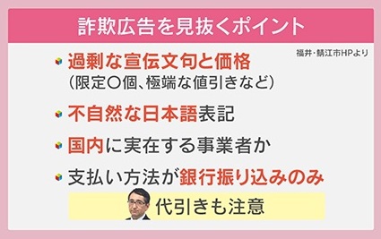 福井・鯖江市はホームページで、詐欺広告を見抜くポイントとして『過剰な宣伝文句と価格(限定〇個、極端な値引きなど)』『不自然な日本語表記』『国内に実在する事業者か』『支払い方法が銀行振り込みのみ』を挙げています。多田氏によると「代引きも注意」ということです。