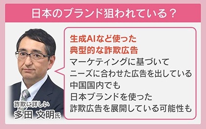 今回のニセ広告について、詐欺に詳しい多田文明氏は「生成AIなどを使った典型的な詐欺広告。マーケティングに基づいて、ニーズに合わせた広告を出している。中国国内でも日本ブランドを使った詐欺広告を展開している可能性がある」と分析しています。