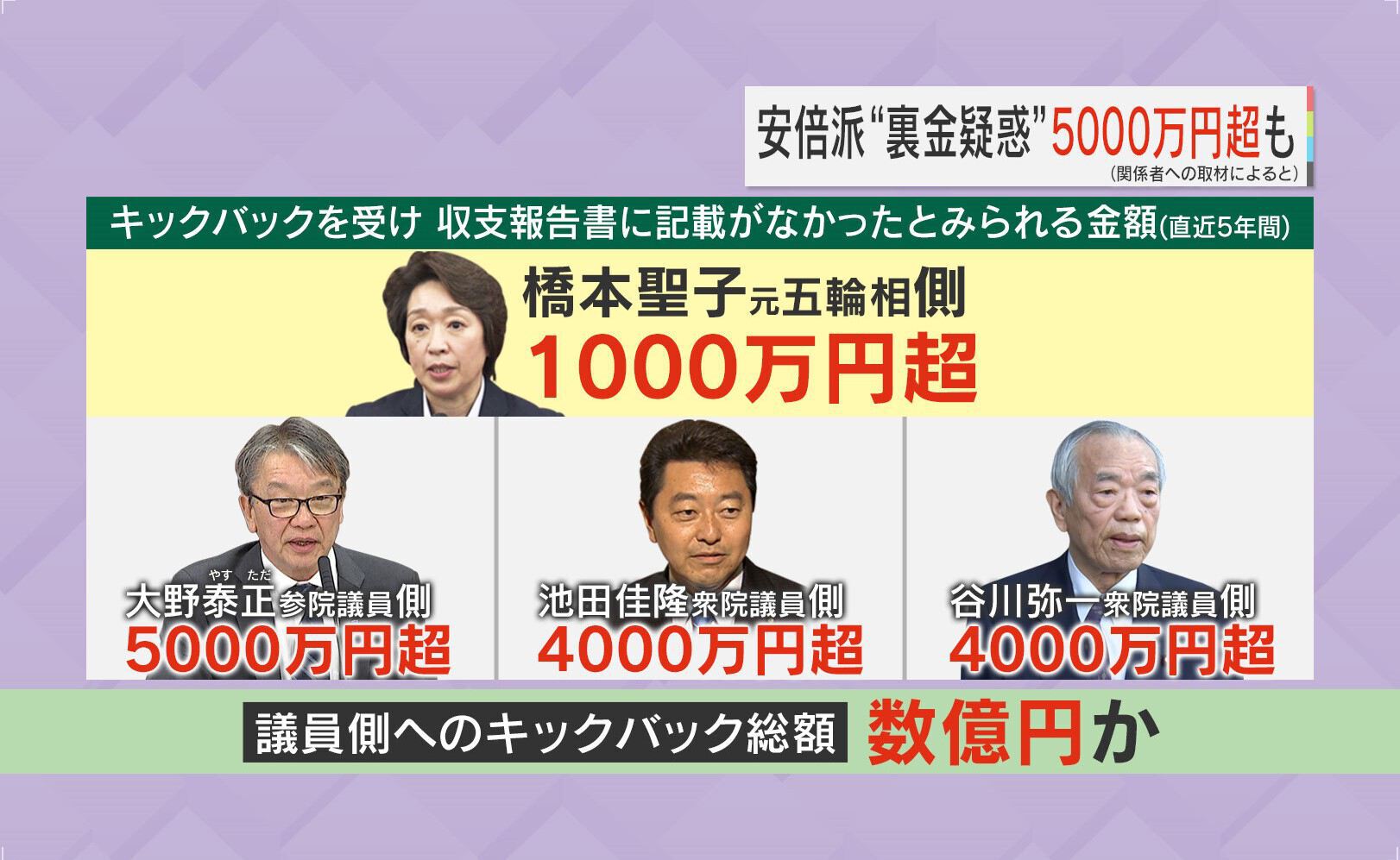 自民党安倍派の松野氏、高木氏、世耕氏、西村氏、萩生田氏、塩谷氏などがパーティー券のノルマを超えた分のキックバックを受け、収支報告書に記載せず裏金化したのではないかという疑惑ですが、新たに4人の議員の名前が出てきました。橋本聖子元五輪相側が1000万円超、さらに大野泰正参院議員側が5000万円超、池田佳隆衆院議員側は4000万円超、谷川弥一衆院議員側は4000万円超などとなっていて、議員側へのキックバックの総額は、安倍派だけで数億円と見られるということです。橋本聖子元五輪相は、「調査をしっかりとしたうえで、しかるべきときに説明責任を果たしていきたい」と話しました。