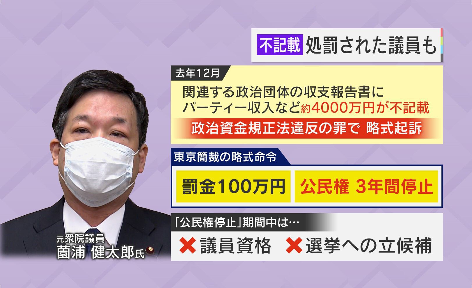 元衆議院議員の薗浦健太郎氏は2022年12月、関連する政治団体の収支報告書にパーティー収入など約4000万円が不記載だったとして、政治資金規正法違反の罪で略式起訴され、罰金100万円と3年間の公民権停止となっています。公民権停止の期間中は、議員資格はなくなり、選挙への立候補もできなくなっています。