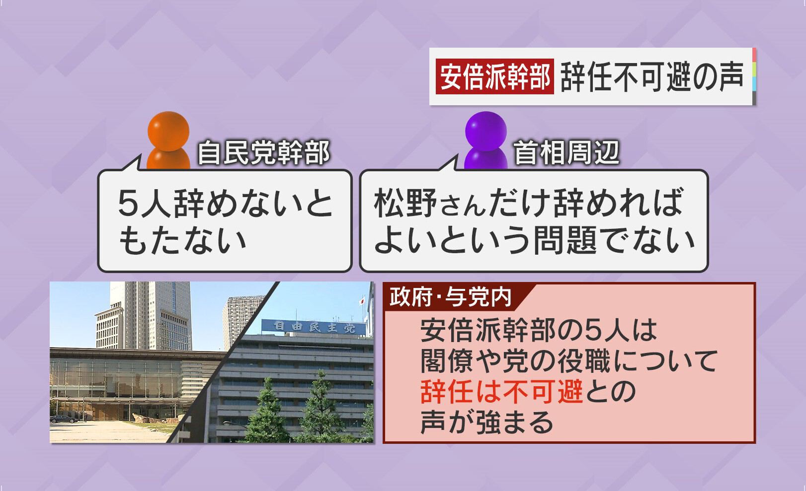 ある自民党幹部からは、「5人辞めないともたない」といった声や、総理周辺からは「松野さんだけ辞めればよいという問題ではない」といった声が聞かれています。政府与党内からは、安倍派幹部の5人は閣僚や党の役職について辞任は不可避との声が強まっているということです。