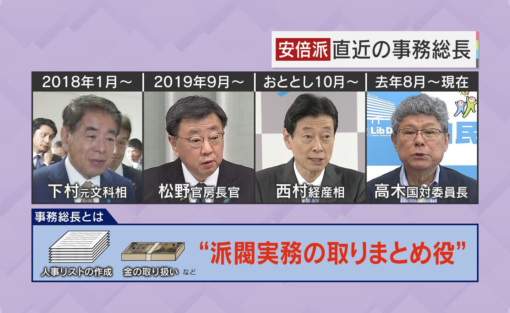 安倍派の直近5年間の事務総長は、下村博文元文部科学相と今回のキックバックの件で名前が挙がっている松野博一官房長官と西村康稔経産相、高木毅国対委員長となっています。そもそも事務総長というのは人事リストの作成やお金の取り扱いなど派閥実務のとりまとめ役です。