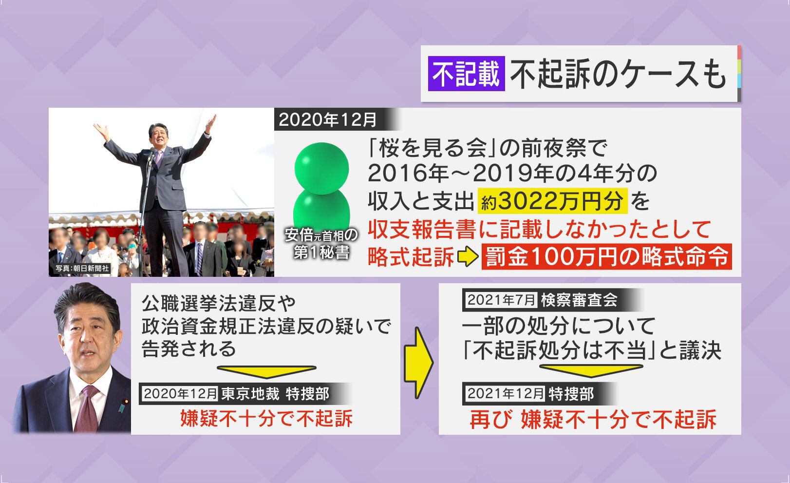2020年12月、安倍元首相の第1秘書は、「桜を見る会」の前夜祭の2016~2019年の4年分の収入と支出約3022万円分を収支報告書に記載しなかったとして略式起訴され、罰金100万円の略式命令を受けています。しかし、安倍元首相は公職選挙法や政治資金規正法違反の疑いで告発されましたが、2020年12月、東京地裁特捜部は嫌疑不十分で不起訴となっています。2021年7月、検察審査会で一部の処分について「不起訴処分は不当」と議決されましたが、2021年12月、再び嫌疑不十分で不起訴となっています。