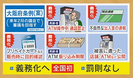 主な条例改正案は、『高齢者はATMの操作中は通話禁止』『不自然な出入金の通報』『プリペイドカードなど、販売時に目的を確認』『高齢者はATMの振り込み制限』などです。義務化を検討していますが、罰則はありません。