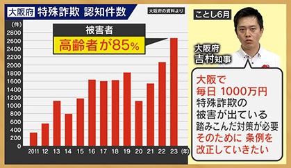 この状況に、大阪府・吉村知事は「大阪で毎日1000万円、特殊詐欺の被害が出ている。踏みこんだ対策が必要。そのために条例を改正していきたい」と語っています。