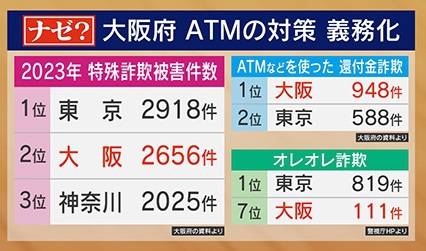 なぜ大阪がここまで厳しいのかというと、2023年の特殊詐欺の被害件数は東京のほうが多く、大阪は2位となっていますが、特に大阪は『還付金詐欺』が多いからです。『還付金詐欺』とは、“お金が返ってくる”などと嘘をついて騙す詐欺のこと。オレオレ詐欺の被害件数だと、東京は819件・大阪は111件なのに対し、ATMなどを使った還付金詐欺被害になると、大阪は948件・東京が588件となり、大阪での被害の多さがわかります。