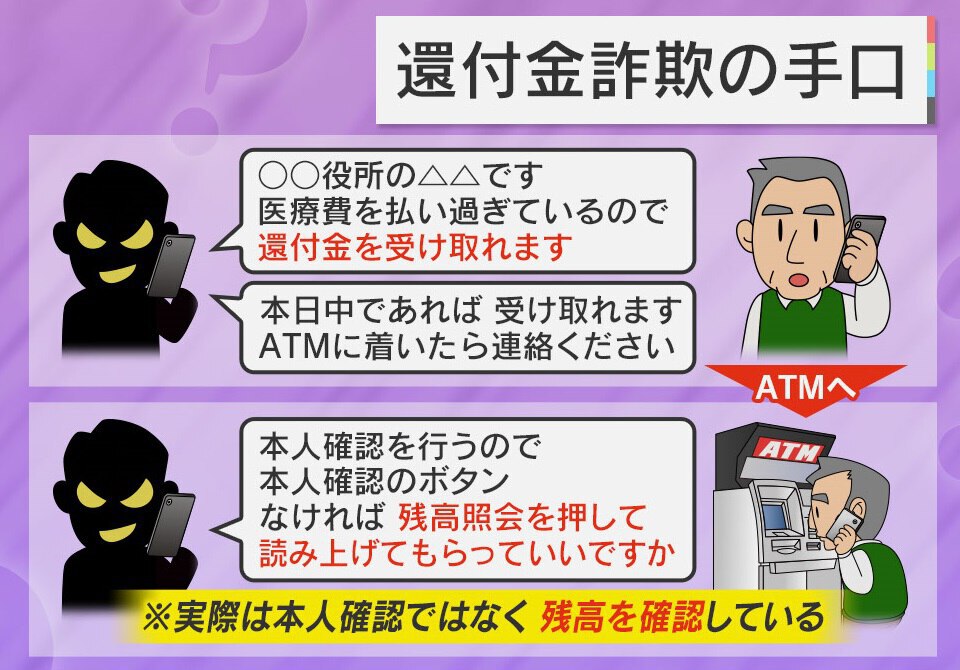 まず役所の人間だと名乗る人物から、「医療費を払い過ぎているので、還付金を受け取れます。本日中であれば受け取れます。ATMに着いたら連絡ください」などと電話が来ます。